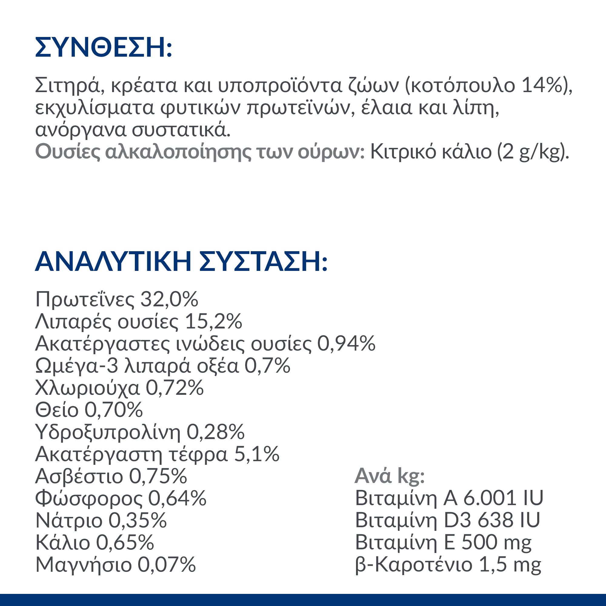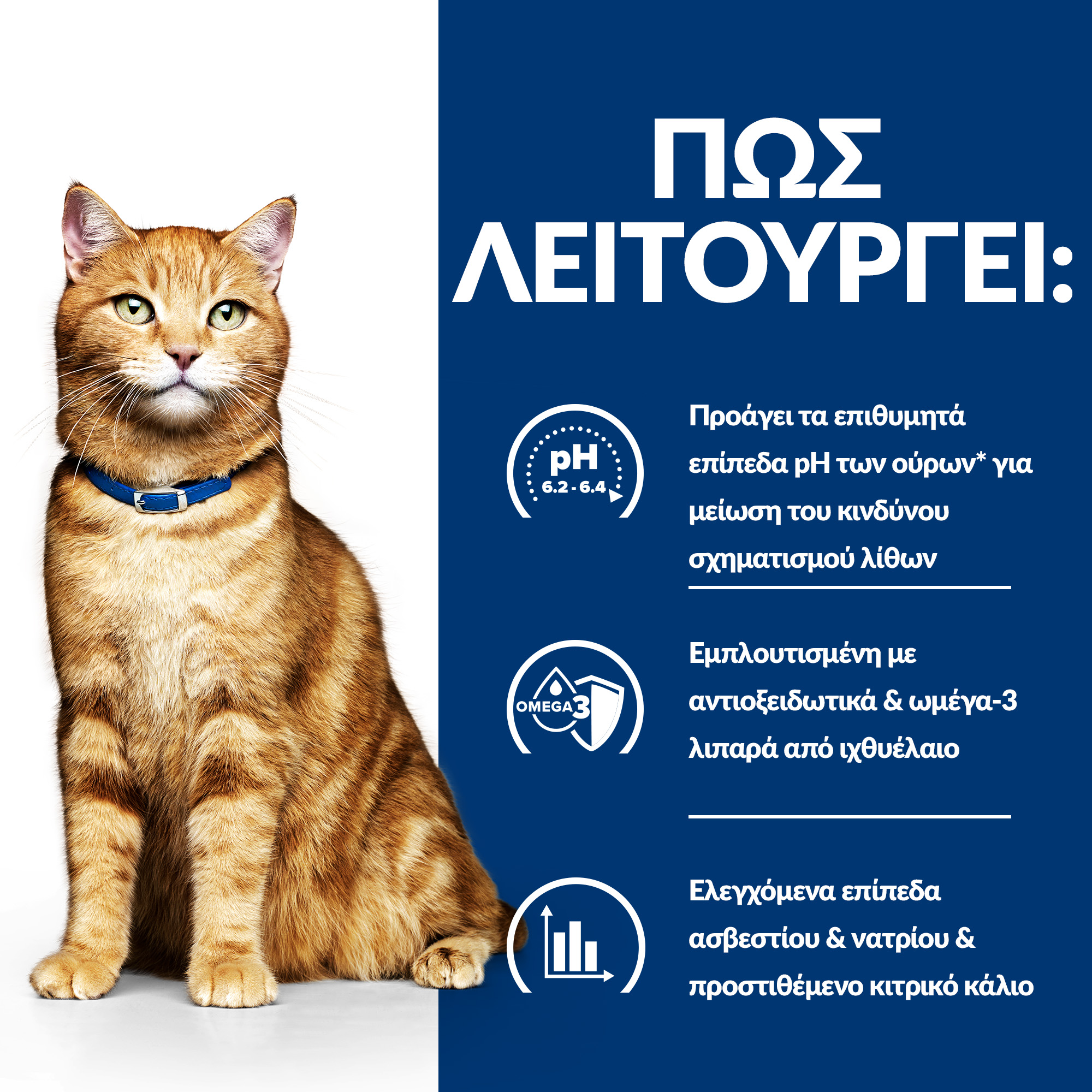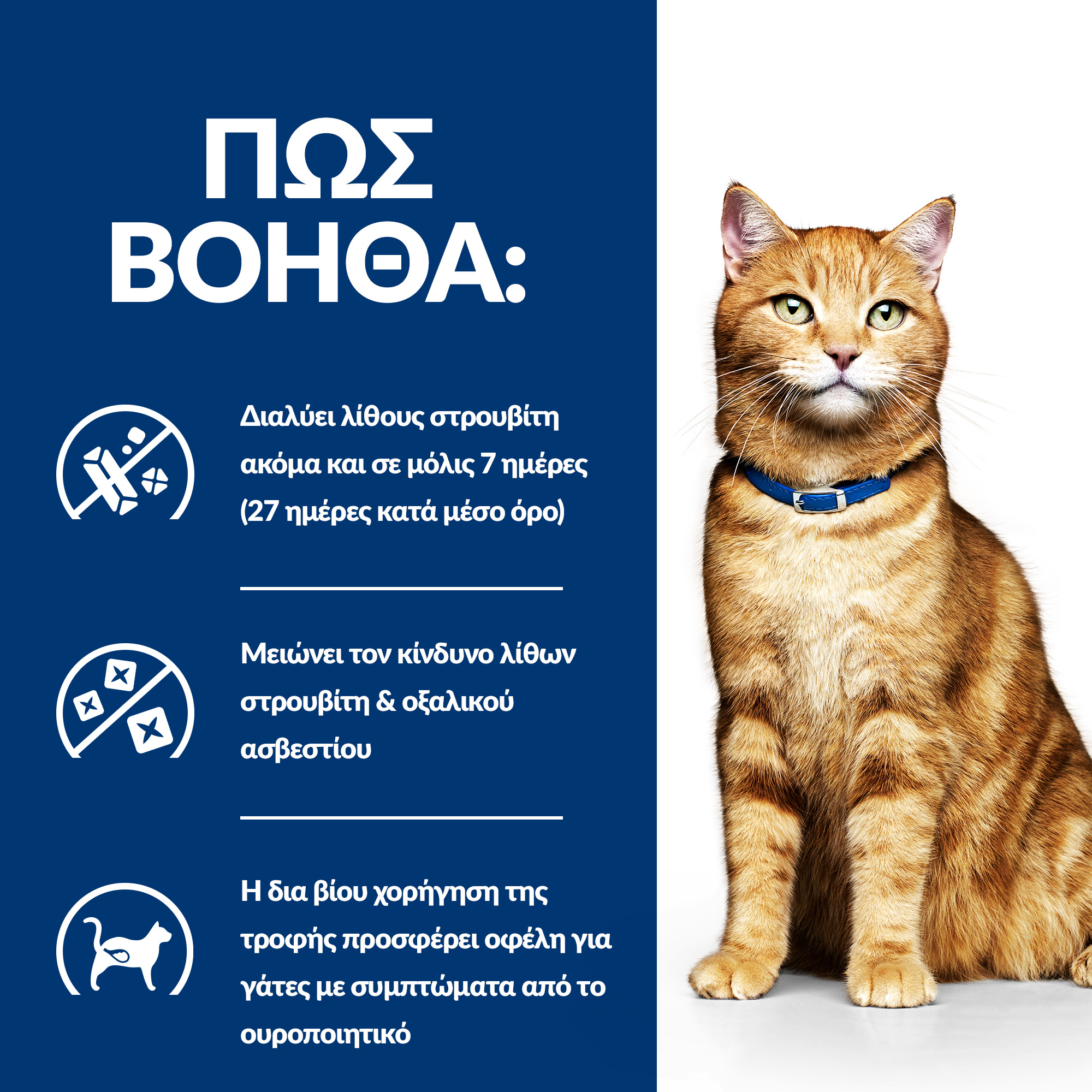 Κλινική διατροφή για γάτες, κατάλληλη για τη διαχείριση κρυσταλλουρίας, ουρολιθίασης, ουρηθρικών βυσμάτων και ιδιοπαθούς κυστίτιδας. Βοηθά στη διάλυση των στειρών ουρόλιθων στρουβίτη και προσφέρει μακροχρόνια υποστήριξη για τη μείωση εμφάνισης και υποτροπής κρυστάλλων και ουρόλιθων στρουβίτη, οξαλικού και φωσφορικού ασβεστίου. Περιέχει μειωμένα επίπεδα μαγνησίου, φωσφόρου και ασβεστίου, με προσθήκη κιτρικού οξέος, βιταμινών Ε και C, και β-καροτένιο. Υψηλή γευστικότητα, εγγυημένο προϊόν.